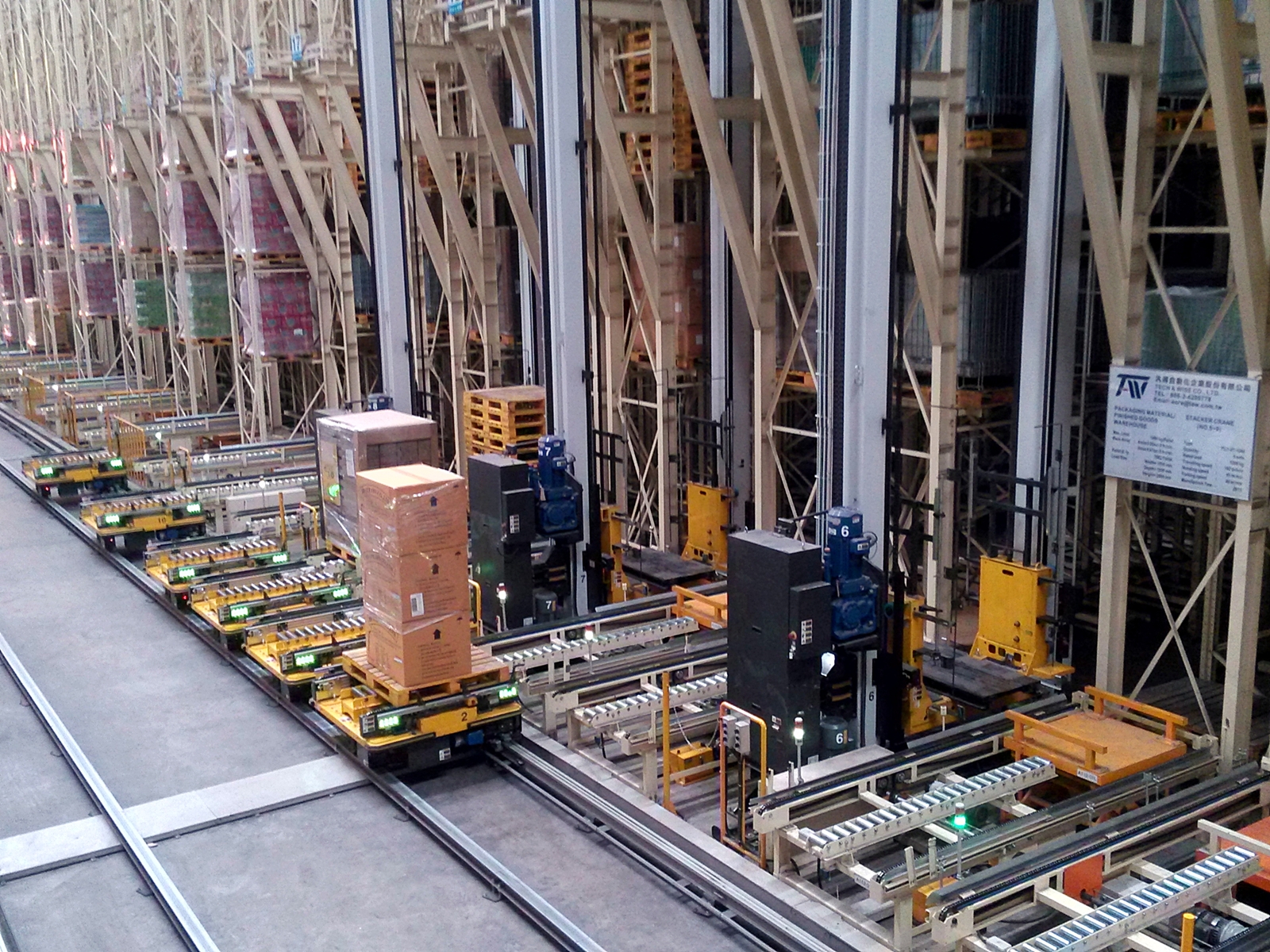 (飲品業,2013年啟用,荷重1000KG,51906庫位,21M高,高架吊車26台,自動搬運高速台車13台)