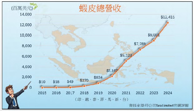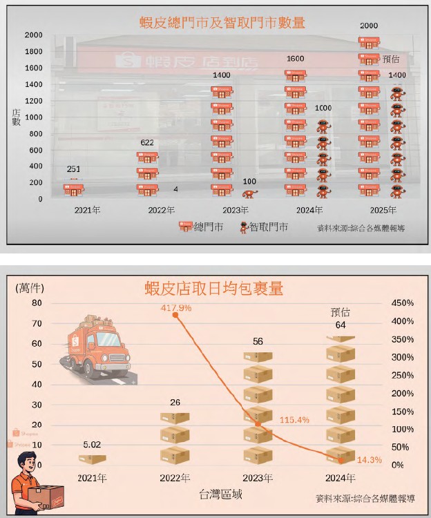 蝦皮自2019 年起營收快速增長,2024年達124億美元,業內消息台灣市場貢獻高達八成。2021年推實體店服務,自雙北擴展全台,並與OK超商、美廉社合作,2025年門市突破2,000家,其中七成為智取店。據報導,蝦皮2024年日均包裹量達64萬件。透過系統優化與行銷策略,蝦皮在電商競爭加劇甚至同業出現負成長的情況下,仍保持市場領先。