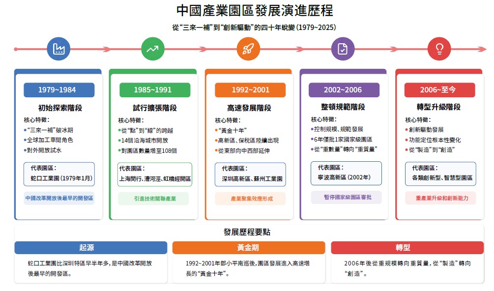 梳理中國園區的發展脈絡,任浩教授將其劃分為五個階段,每個階段都烙印著鮮明的時代特徵。