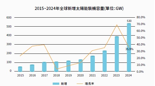 從全球來看,2024年全球太陽能市場呈現出蓬勃的發展態勢,新增裝機容量達到530GW,同比增長35.9%,累計裝機容量更是首次突破2TW,高達2,076GW。在全球太陽能市場中,中國、歐盟、美國作為主要的太陽能市場,其新增裝機容量合計占比超過70%,而印度、土耳其、沙特、巴基斯坦等新興市場也展現出了強勁的增長勢頭,增速超100%。