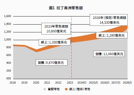 拉美消費市場近年穩步向上,前景樂觀。根據歐睿國際(Euromonitor)的預測,從2024年至2028年,整個拉美的零售總額複合年增長率將達到6%,而同期的網上零售額複合年增長率預計為11%,實體零售額複合年增長率則為5%。網上零售額佔拉美零售總額的比重,將從2023年的12.3%增加到2028年的15.9%。(圖1拉美零售總額)