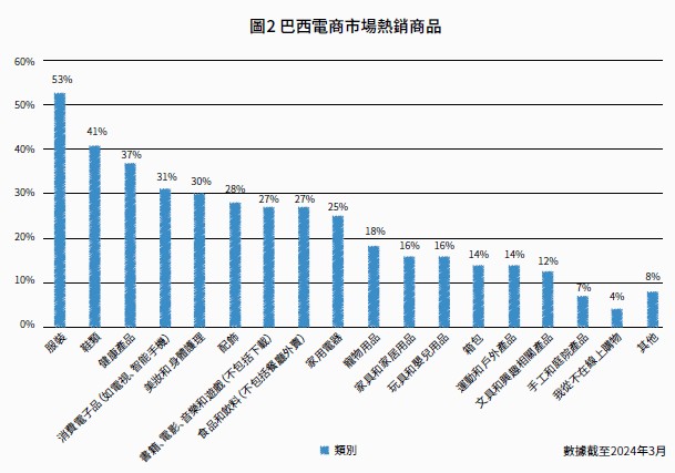 疫情導致消費模式改變,消費者紛紛轉向網上購物,趨勢持續至今。拉美消費者最常購買潮流用品以及須定期補給採購的商品。根據歐睿國際的數據,2023年電器及電子產品是最多人在網上購買的產品,佔網上零售總額22%,其次是時裝(14%)和食品(8%)。(圖2 巴西電商市場熱銷商品) (圖3 墨西哥電商市場熱銷商品)