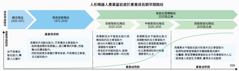 人形機器人產業的崛起並非偶然,而是AI技術反覆運算、產業需求升級與政策支持共同作用的結果。生成式AI與大模型技術的突破,為人形機器人賦予了初步的認知與決策能力,使其從“機械執行者”升級為“智慧協作者”;汽車產業、工業製造積累的系統控制等技術,為機器人產業提供了成熟的技術遷移路徑;中國政府公布的戰略規劃則為產業發展提供了明確指引,其中,中國2023年發佈《人形機器人創新發展指導意見》,明確提出2025年初步建立創新體系、2027年形成安全可靠的產業鏈供應鏈體系,打造經濟增長新引擎的目標。臺灣政府則提出「智慧機器人產業推動方案」,希望透過跨部會合作,結合在地力量,促進產官學研鏈結,以加速自主智慧機器人應用落地,全面提升臺灣在全球智慧機器人產業的競爭力。透過機器人中心和前瞻研發的補助,培育具系統開發能力的機器人新創公司。其中,國家發展基金匡列新台幣100億元,由政府結合民間專業投資機構,共同投資發展智慧機器人相關企業。