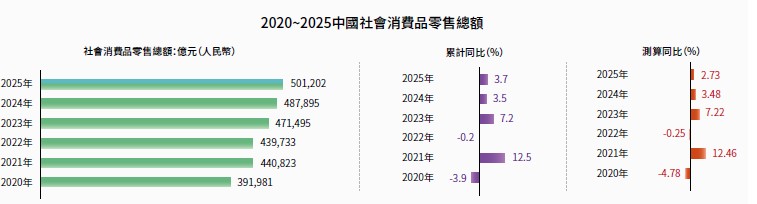 其中,消費仍然是全年經濟增長的壓艙石。2025年社會消費品零售總額501,202億元(單位:人民幣,下同),增長3.7%。“國家補貼+以舊換新+服務消費券”組合拳帶動了穩定的需求,尤其是2025年上半年增速可觀,下半年消費者“觀望情緒”加深、“換季需求”疲軟,以及國家補貼力度下降的情況下,整體消費也呈現下滑態勢。