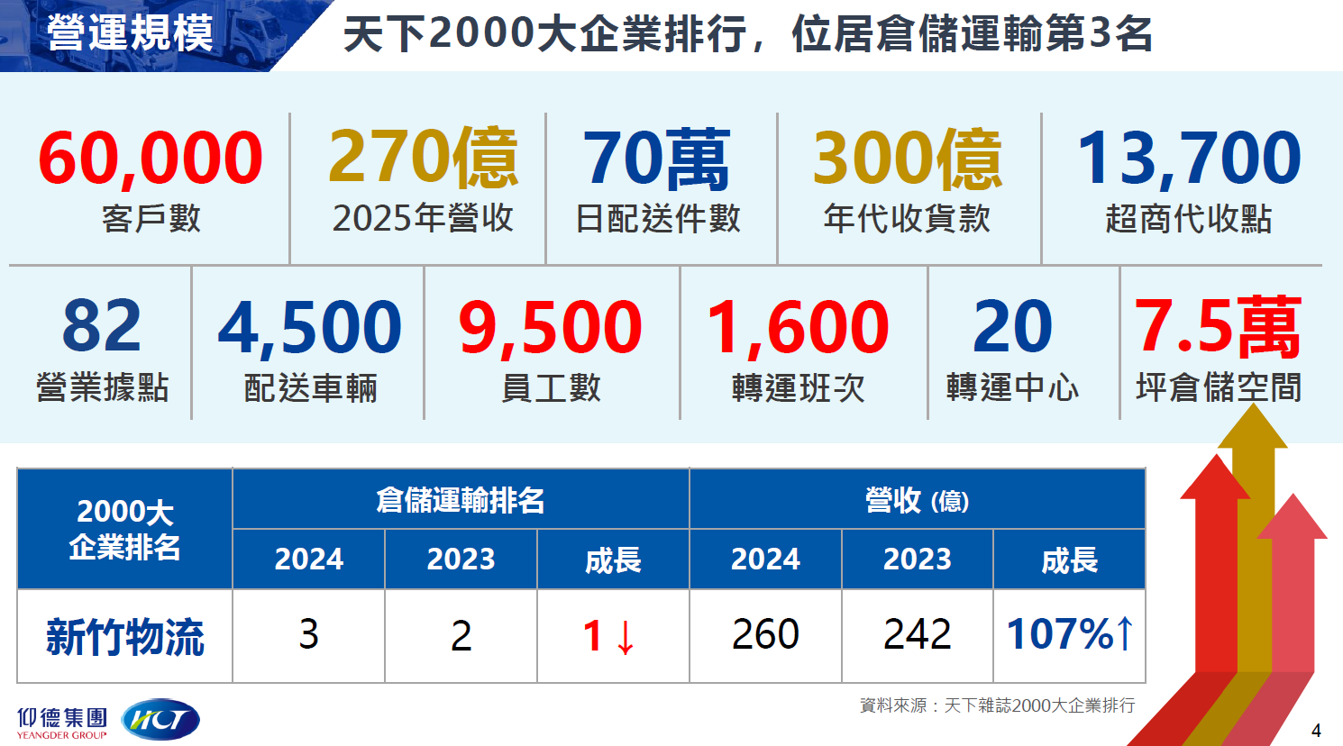 • 主要從事貨運及綜合物流業。從傳統運輸轉型為科技物流。每天運量超過90 萬件,市占全台第一。客戶數約有60,000 家,年代收貨款金額約新台幣300 億元,超商代收點約13,700 個。
