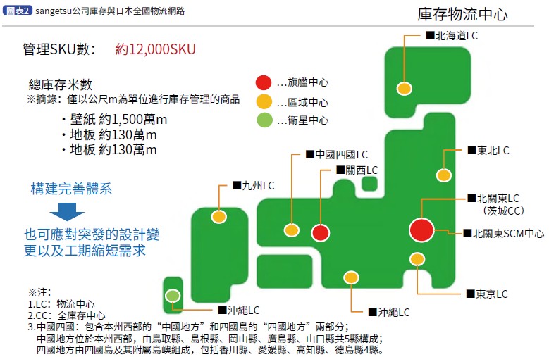 目前sangetsu整體經營約12,000個SKU的產品,總庫存量方面,壁紙約1,500萬平方米、地板材料約130萬平方米、窗簾約186萬平方米等,這些庫存分佈在包含旗艦中心在內的日本全國9個物流中心。每個物流中心並非常年都保有sangetsu經營的全部建材庫存,甚至部分物流中心會對部分產品採取無庫存模式,但北關東物流中心和關西物流中心幾乎保有全部SKU的庫存,sangetsu將這兩個據點作為旗艦中心,為日本其他物流中心進行庫存補充。物流企劃開發室長佃大輔表示sangetsu自身沒有生產工廠,但銷售自主企劃、開發的產品,因此各物流中心都具備一定的庫存保有量,以及產品出庫、配送的功能。目前,sangetsu在日本全國每天約有400條配送線路、運營約540輛貨車。原則上一條線路配備一輛貨車,但部分區域也會根據情況調配2至3輛。鮮為人知的是,建築行業的一大特點是配送前置時間極短,而sangetsu的基本運營體制是“今日接單,明日送達施工現場”,正因如此,才需要在日本各關鍵節點保有一定的庫存。sangetsu承接的訂單,大部分配送給代理商,也有部分直接配送至建築工地,或經由代理商配送至下游的內飾施工企業。如此一來,這座sangetsu的旗艦物流中心,必然需要保有相當規模的庫存。