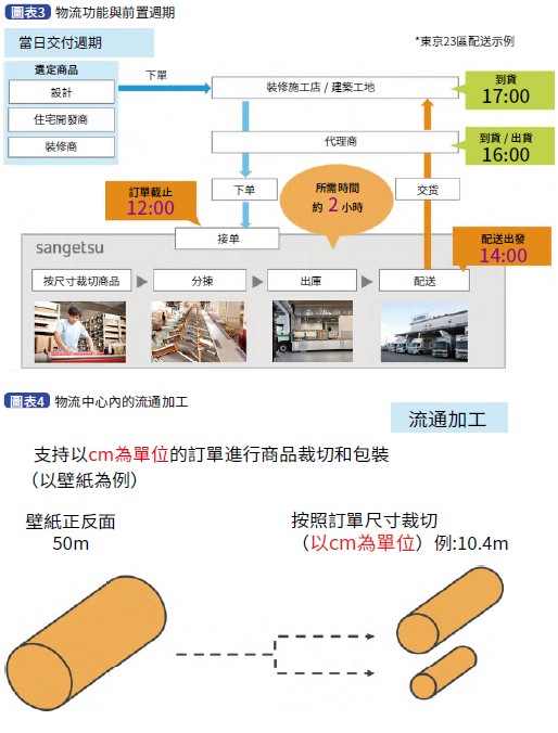 1956年,sangetsu以開始經營壁紙為契機,逐步擴充產品線至地板材料、窗簾、座椅面料等,發展為經營綜合內飾建材的企業。2014年,首位非創始人家族出身的社長就任,制定並推行中期經營計畫。在當前的中期經營計畫中,五大重點執行政策之一的“強化解決方案提供能力”,也在推進“物流體系佈局與功能上的拓展和強化”。
