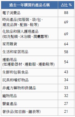 在多個產品類別中,有多項商品在採購時傾向選擇外國品牌,包括奢侈品、化妝品和個人護理產品、非處方藥物和保健品、運動用品、嬰童產品,以及電子消費品。