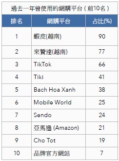 蝦皮( Shopee) 與來贊達(Lazada)是越南的主要電商平台,提供電子產品、時尚產品、化妝品及生活用品等一系列產品。蝦皮把握該國智能手機普及率高的優勢,採取以流動版網店為主的策略,以方便易用的介面脫穎而出;來贊達則不斷有新貨上架,並擴展物流網絡至鄉村地區,開拓新商機。中國的知名社交媒體平台TikTok,結合直播與線上購物,位居第三大受歡迎平台。該平台允許主播展示商品,與觀眾即時互動,能即時推高銷量。